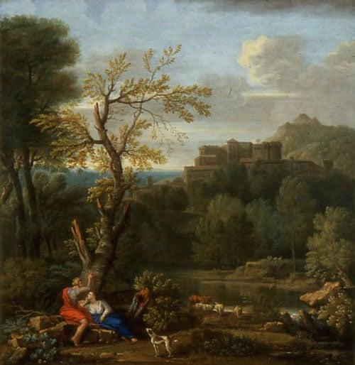 In this classicised landscape in the manner of Gaspard Dughet, Wootton has relegated the protagonists the lower left-hand corner. This type of landscape with an ostensible 'history' subject represents the bridge between true history painting, where the role of the landscape is entirely subservient to the enactment of the subject, and the acceptance of pure landscape as a subject in its own right. The subject of the painting comes from Ariosto's poem, Orlando Furioso (1516), which tells of the conflict between Christians and Saracens at the time of Charlemagne.