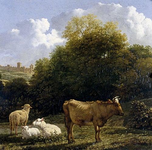 The cattle in this landscape painting are placed against a background of thick foliage. In the left distance, a city wall can be seen on the horizon. This painting was part of a collection of 117 works belonging to the industrialist and engineer F.D. Lycett Green and bequeathed to York through the Art Fund, in 1955, in recognition of the remarkable efforts made after the Second World War by its curator to transform it into a gallery of international importance.