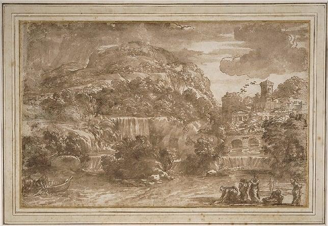 Landscape with Fishermen and Washerwomen by a Cascade, 1660–1660