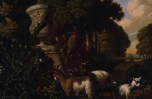 A park-like landscape at evening; a mass of dark trees, olive green and brown occupies the left half of the canvas. The trees in the middle distance to the right are lit by the setting sun and there is a man and dog crossing the path of some goats. In the foreground there is a sculptured urn with wild flowers at its foot. This work was originally donated to the National Loan Collections Trust, whose collection has now been placed at Cannon Hall by the Art Fund. One of nine gifts and one bequest to eleven museums by S C Turner through the Art Fund between 1929 and 1949.