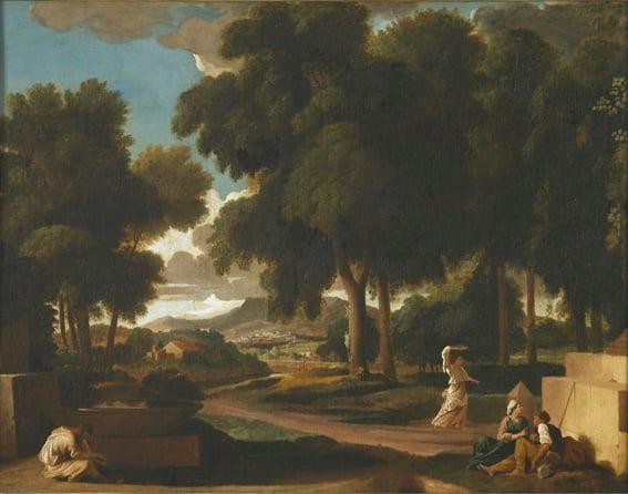 A woody landscape with figures. One of two paintings purchased with funds supplied by Dunedin.