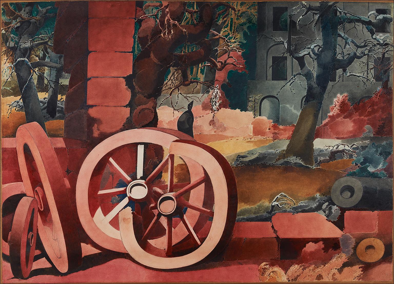 With its gnarled trees, ruined buildings and mysterious black-cloaked figure, Landscape with Red Wheels represents the work of Edward Burra at its most unsettling.