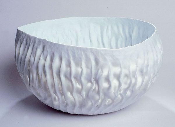 Large curved bowl with pleating effect in the porcelain on the sides. Diameter is 35 cms.