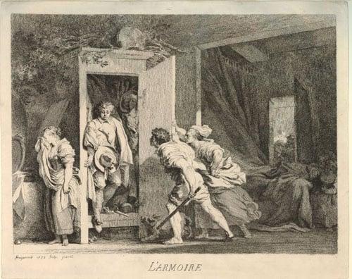 A couple opening a wardrobe are furious to find their daughter's lover inside. The young woman is crying on the left, while a nosey crowd is watching the scene on the right. This etching is a duplicate from the Albertina collection in Vienna, one of the largest and most important print rooms in the world.