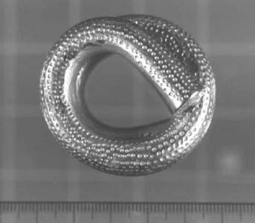 Decorated with punched dots except for a plain zone forming the inner surface. It is tightly coiled & is thought to have been reworked in antiquity to form a pendant-like votive offering.