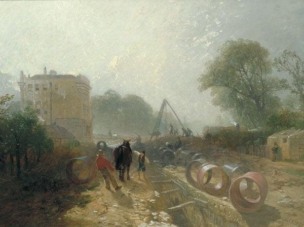 The exact location of the view in this unusual picture has not been identified but it is almost certainly in north London, most probably around Islington or Stoke Newington, or near the artist's home on the border of Camden and Hampstead. The laying of large cast-iron pipes would have been a common sight during the second half of the nineteenth century. A great deal of work was undertaken at that time to increase the supply of clean water to an ever-growing number of customers.