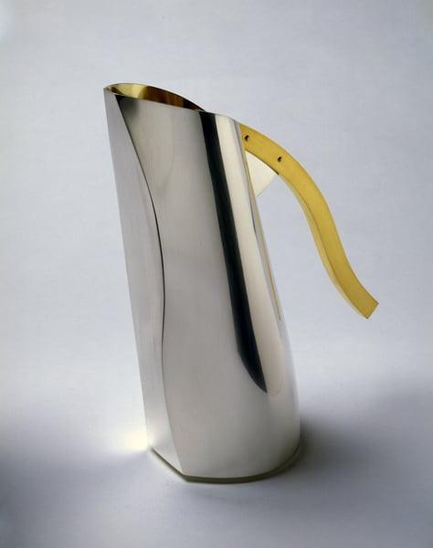 The jug has a scored and folded body, formed as a cylinder, with the curved leading edge establishing movement and rhythm. The handle forms an undulating wave echoing the movement in the main body. Decoration is restrained to a pair of rivets attaching the handle to the body through a triangular form, which itself creates an additional geometric perspective.