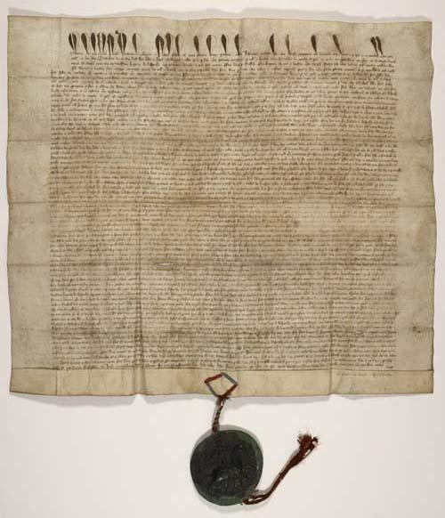 Exemplification of proceedings relating to Martley, Worcestershire in the reign of Edward III. Includes part of the fifth great seal of Edward III.