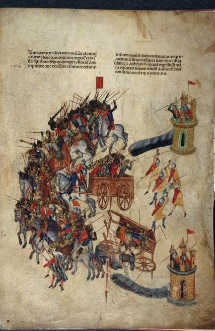 9 leaves of an illuminated manuscript of Frontinus, Stratagems containing portion of Book II, chapters iii-v. Series of coloured drawings occupying normally two-thirds of each page below the text.
