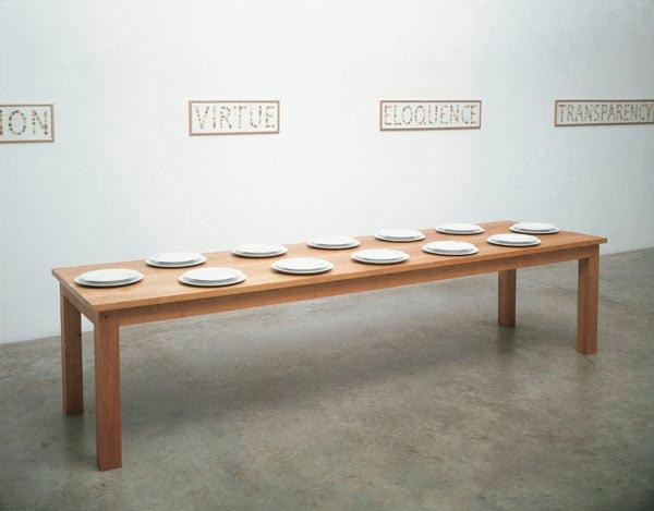 The French Revolution has been a recurring theme in Hamilton Finlays work and here he conjures a dinner party where the guests are the female protagonists and heroines of the Revolution. The plates have the guests' names and a wild flower painted on them. The elegant place settings initially evoke an image of a convivial party. However most of these women met violent deaths, thus the dinner party becomes a last supper. This duality, the contrast of light and dark, is central to Hamilton Finlay's work.