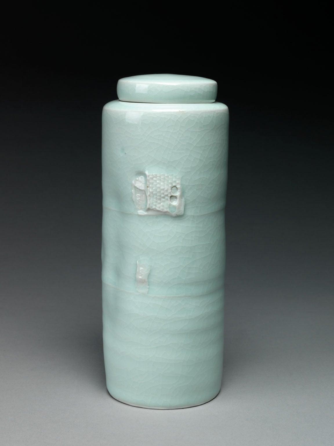 A jar made of Limoges porcelain, thrown and slightly squashed. Decorated with three applied darn-like motifs and covered inside and outside with a very pale bluish-green, crazed celadon glaze.