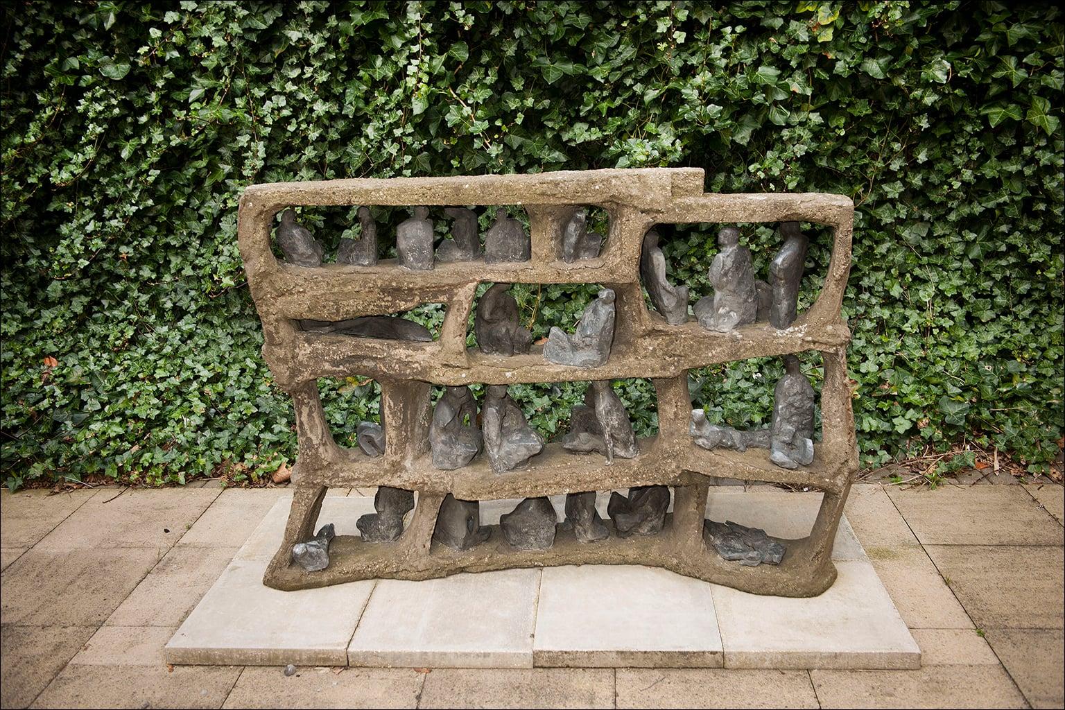 This sculpture features 26 smaller lead pieces created from drawings made in Anglesey and Cornwall in the 1950s. Wright would sketch on site before creating larger drawings at his studio, experimenting with grouping figures together on page. This sculpture sees each individual piece form its own position and personality within the concrete matrix.