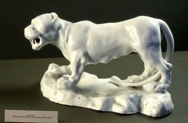 The lion and lioness in white porcelain face each other standing on rockwork bases, their jaws open. Probably modelled on Oriental figures.