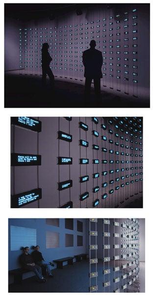The installation consists of over 200 small LED screens displaying text fragments from Internet chat rooms. The texts, which are constantly updated, are simultaneously read or sung by a voice synthesiser. The work provides an extraordinary indication of the power of networked communication technologies to connect people and express the views of individuals.