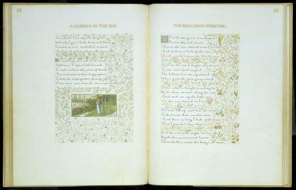 A 56 page illuminated manuscript, containing a number of poems by William Morris, written in his own hand, each page ornamented with elaborate designs of fleurons and leafy branches. Also contains paintings and decorations by others in Morris' circle.