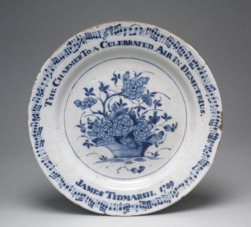 Plate with a border of music of the song 'The Charmer' and the name James Tidmarsh 1739 (not known).
