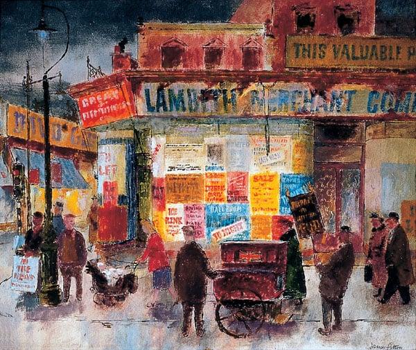 Depicts a street scene in Brixton in post war London with figures looking at a window full of bills on a derelict shop front. Fitton felt that 'it seemed to be blooming like a flower in such a drab setting'.