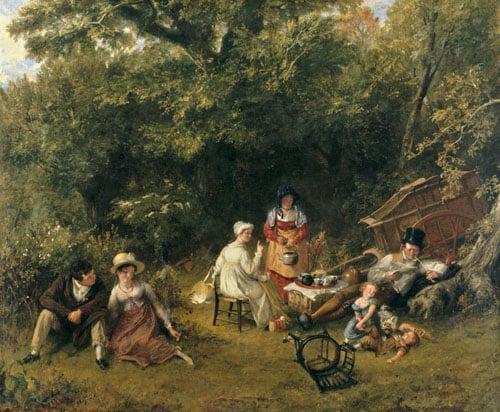 This is an early and particularly attractive example of the work of this Anglo-American artist who specialised in humorous genre scenes, often taken from popular literary sources. It is an interesting social document of a party spending the day in the woods, then a very common thing among the middle classes in summer. The group of figures appears to be from the East End, with a cart, presumably hired for the occasion, to transport themselves and their belongings. Other interesting features are the blue and white tea service (possibly Spode) and the cane- and rush-bottomed chairs, of a type which inspired chair designs by William Morris and E. W. Godwin some forty years later.