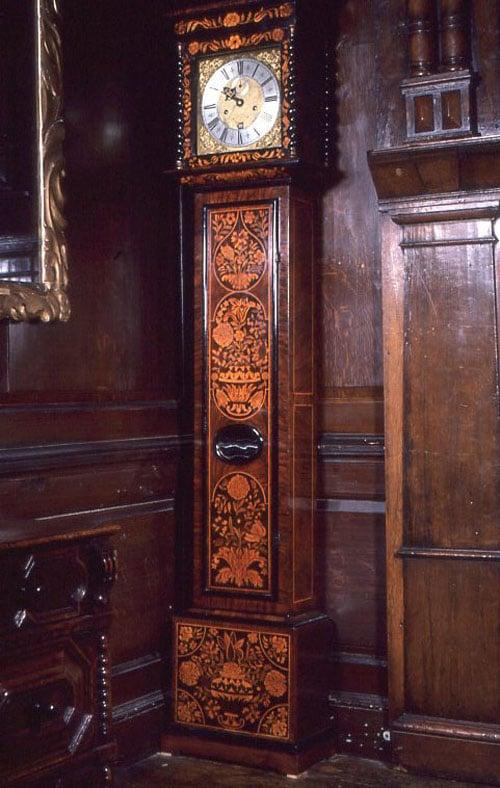 A long-case clock, English, c 1690, made by Richard Baker of the London Clockmaker's Company. Marquetry case ornamented with floral designs.