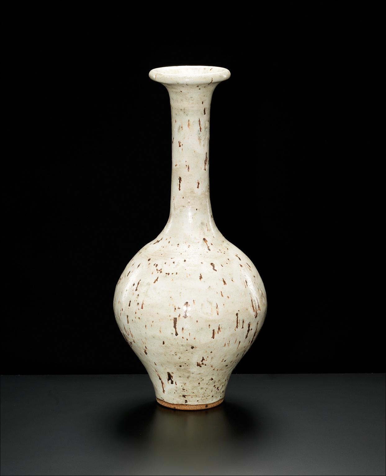 Long-necked Vase is a fine example of the work of studio potter Lucie Rie, and marks a pivotal point in her career. Rie was born in Vienna in 1902 and trained in ceramics at the Kunstgewerbeschule. She married Hans Rie in 1926 and exhibited her work in Paris, Milan and Brussels. After the Nazi annexation of Austria in 1938, Rie emigrated to Britain and settled in London. Rie is known for her delicate, Modernist pottery influenced by Japanese forms. During the 1950s she worked on a series of cylindrical vases, but Long-necked Vase marks a turning point in which a bulbous waist appears in her work. This anticipates the bottle vases developed by Rie from the mid-1960s onwards, vessels that became her signature form. The potter achieved the effect of the brown speckles in the white glaze by adding small amounts of granular manganese dioxide to her clay. Long-necked Vase was originally owned by the watercolour painter and ceramics collector Eileen Young (1896-1986), who acquired around 70 of Rie’s pieces. It now enters the collection of the Victoria Art Gallery in Bath, where it joins work by prominent studio potters, including Rie’s friends Bernard Leach and Hans Coper.