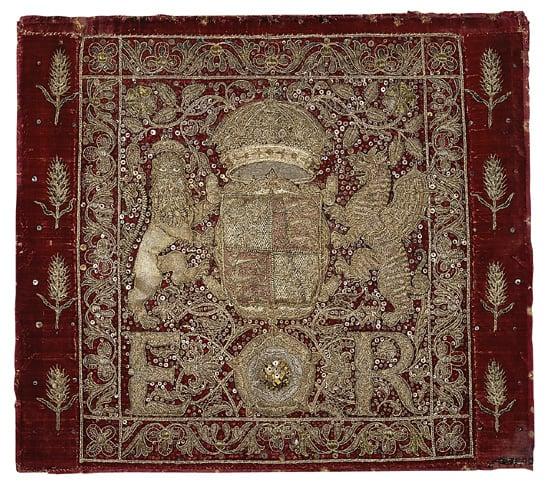A burse panel of crimson velvet worked in purl wire, gold and silver-wrapped threads with the Elizabethan Royal cypher in raised work.