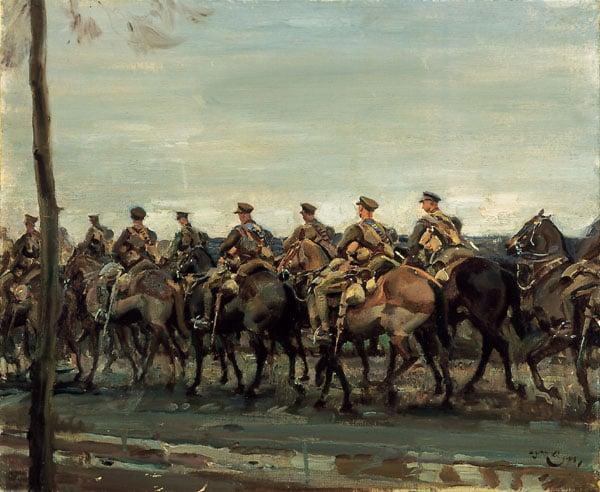 Depicts the backs of horses and mounted calvary moving to the left of the work. Munnings became the Offical War Artist attached to a Canadian cavalry regiment serving in Northern France during the First World War.