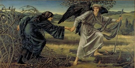 A Chaucerian Daun Cupido extending his hand to a pilgrim emerging from the entanglement of briars.