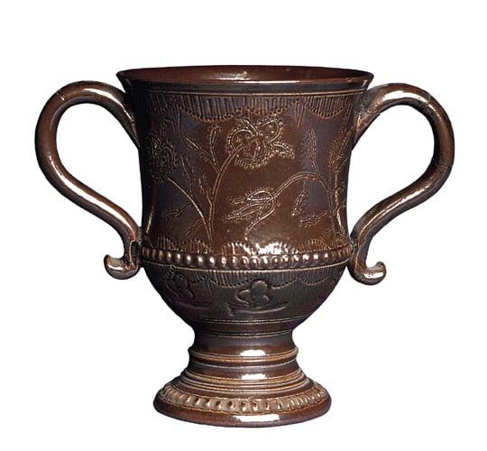 Two handled brown stoneware loving cup with lustrous brown salt glaze. Incised decoration of flower heads and other motifs, and inscribed 'DBS/maker/Alfreton'