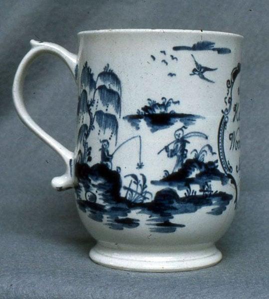 Chinese river scene depicted on one side of mug with large insects and distant flight of birds. Under the handle the mug is signed by Richard Phillips and inscribed: 'Ann/Hammond/Woodbridge/April 9th/1764'.