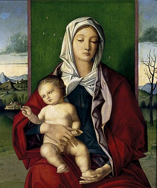 The Madonna and Child are seated in the foreground of this painting before a dark green backcloth. This backcloth serves as a divider between the immediate foreground and distant landscape background. This painting was part of a collection of 117 works belonging to the industrialist and engineer F.D. Lycett Green and bequeathed to York through the Art Fund, in 1955, in recognition of the remarkable efforts made after the Second World War by its curator to transform it into a gallery of international importance.