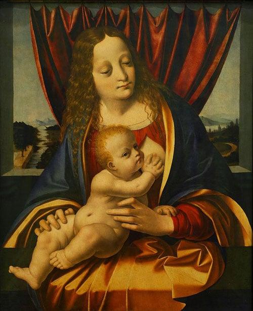 The artist, one of Leonardo da Vinci's pupils, is of particular interest because of the copies he made of his master's paintings. The panel shows the Madonna supporting the Child, who is resting on a cloth-draped ledge. The Child reclines to the right and touches His mother's breast. Behind the half-length figure of the Madonna we can see glimpses of landscape beyond a crimson-curtained window. The panel is in an excellent state of preservation and is displayed in a finely carved Renaissance frame.