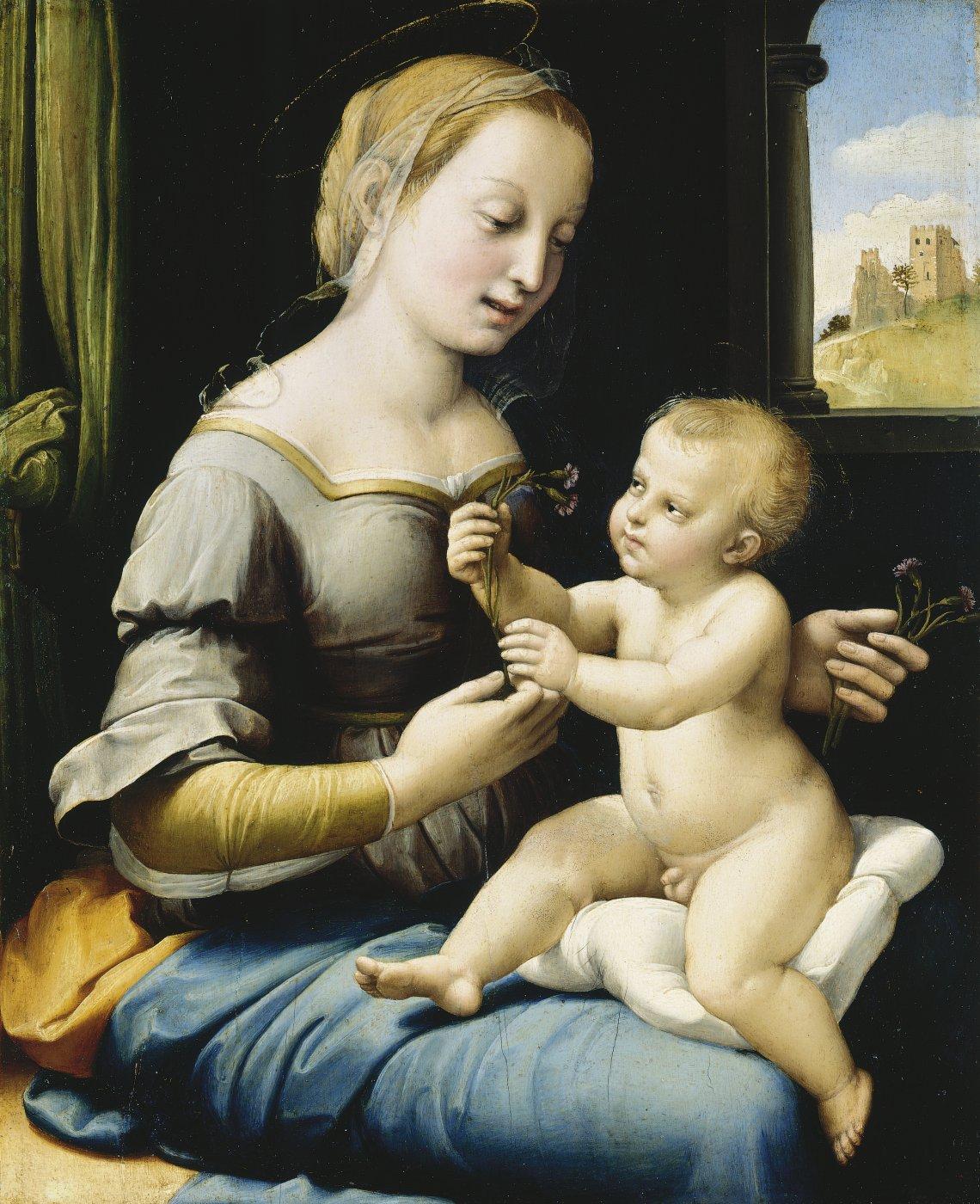 The child's attention has been caught by the delicate flowers she holds, the pinks, which are symbolic of love and betrothal. The work conveys a quality of simple human pleasure in a moment of intimacy. It dates from the period when Raphael went to Florence to study the great masters of his day.