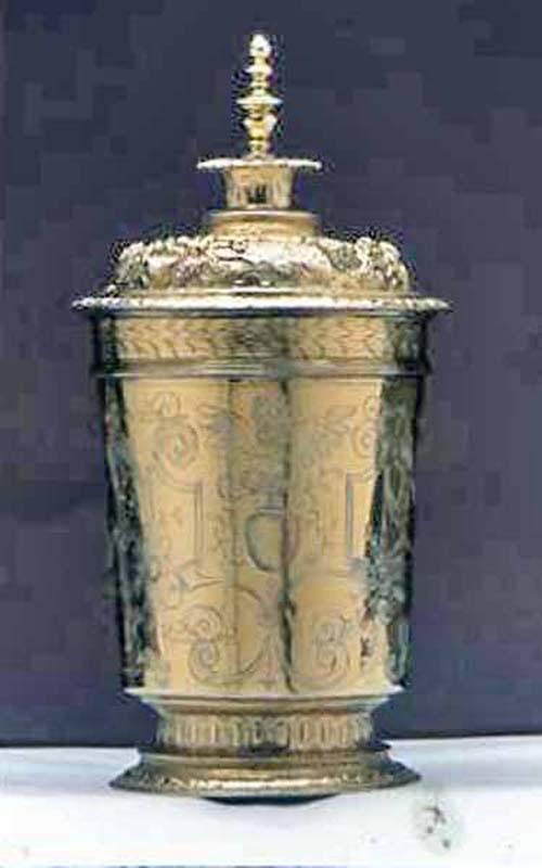 An Elizabethan cup with cover. The cover has a slender baluster-finial, lobed disc-embossing, repeating design of fruit and foliage, engraved inside with a Tudor rose. Type of cup referred to in Tudor inventories as a Magdalin or Maudlyn Cup because they resemble the vessel containing ointment from 16th century paintings of Mary Magdalen.