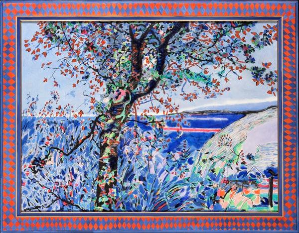 A highly coloured depiction of the tree which stands at end of Sutton's garden in Manorbier in Pembrokeshire. Sutton's canvas is optimistic and cheerful, but it also contains a sense of introspection and enquiry. He captures the tree over a period of time rather than one moment which reflects the artist's relationship with trees as a source of inspiration and elemental energy.