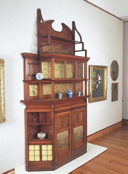 Originally designed as a chimney piece by e.w. Godwin & made by William Watt. Exhibited at Exposition Universelle, 1878, & decorated by Whistler. After the exposition the piece was transformed into a cabinet.