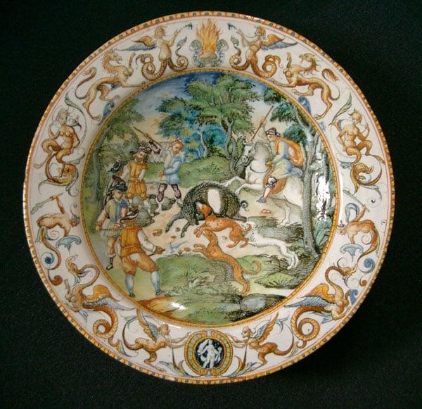 A large dish from a spectacular maiolica service made to commemorate the marriage of Alfonso II d'Este, Duke of Ferrara in 1579. The centre of the dish features a painting of a boar hunt after an engraving by Johannes Stradanus which itself was based on a painting by Marten de Vos. A maiolica service was less expensive than silver but still prestigious, and was intended more for display than regular use.