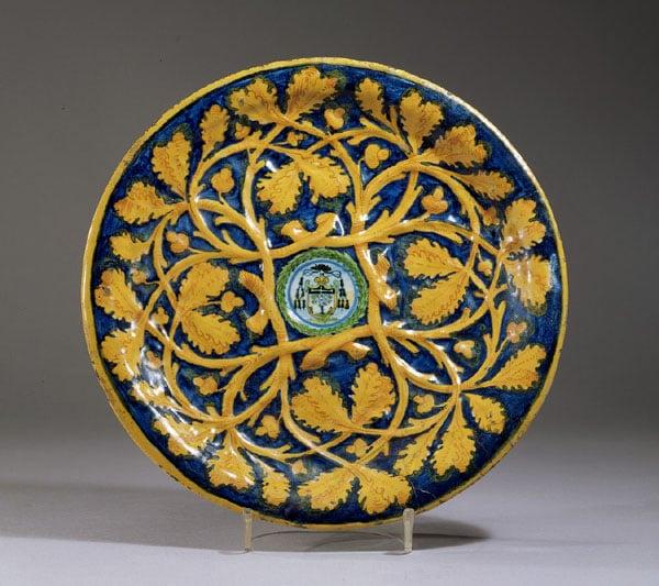 Plate decorated with oak branches and leaves moulded in relief with a coat of arms in the centre. Attributed to the 'painter of the so-called Della Rovere dishes', active in Urbino in the 1540s.