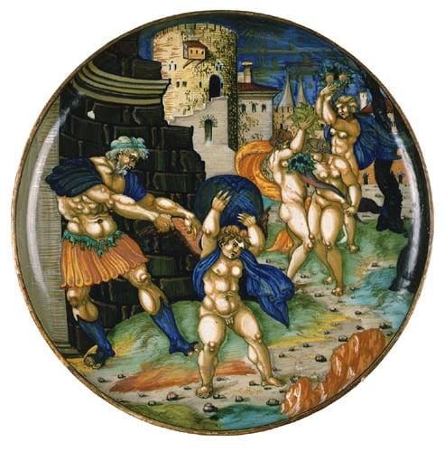 Maiolica dish painted on the front with a political allegory, referring to a contemporary event, the Sack of Rome of 1527.