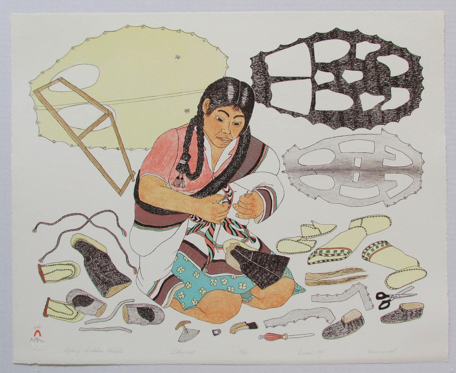 Kananginak Pootoogook was one of the first printmakers in Cape Dorset, and remained very active with the studio from its inception in 1959 until his death. This work is dedicated to the documentation of customary craft, to the making of kamiks, sealskin boots essential to survival in the Arctic environment. It is almost diagrammatic, imaging their components, the techniques and tools involved, and the boot at various stages of its manufacture. The work is at once a simple and eloquent expression of a form vital to traditional lifeways. This acquisition was presented by the Art Fund and the Esmée Fairbairn Foundation.