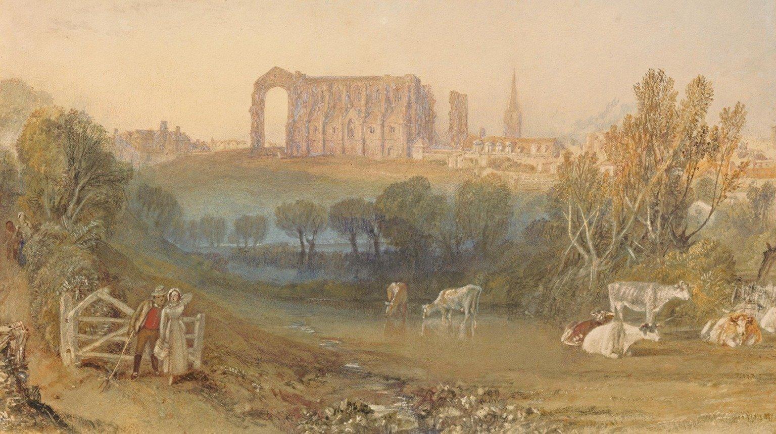 Turner’s watercolour shows the abbey from the north, with the distant ruins bathed in a glorious golden light. The River Avon can be seen in the middle ground, while in the foreground cattle bask in the warm sun. A couple are engaged in conversation on the left, and several more figures can be seen approaching down a path, adding to the drama of the composition.