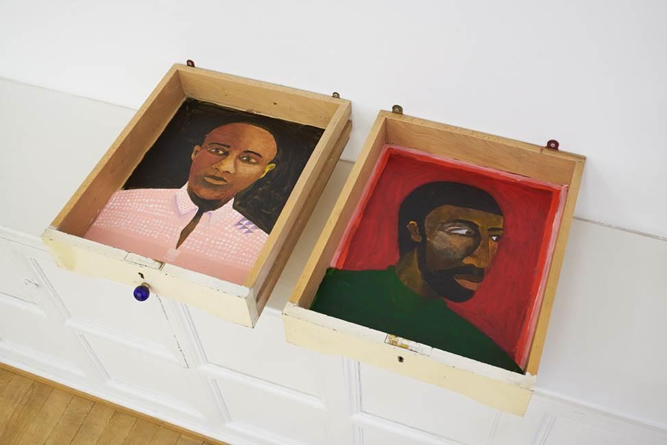 One of two recent portraits by Lubaina Himid which have been acquired for the Rugby Collection at Rugby Art Gallery & Museum (RAGM). These paintings show faces painted on the insides of found drawers, suggesting figures that are hidden away and only occasionally revealed.