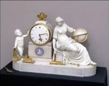 George III ormolu mounted white marble mantle clock decorated with Derby porcelain biscuit figures. The reeded plinth with rounded corners is mounted with an allegorical scene of navigation and astronomy. The white enamelled dial is surmounted by an ormolu-turned finial with a circular Wedgewood plaque below.