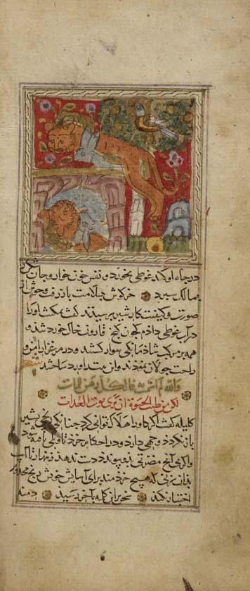 The manuscript is a translation by Abu'l-Ma'ali Narullah of fables told to the Indian King Dabishlim by the Brahman sage, Bidpa'i. 208 folios with 2 full-page miniatures and 65 miniatures in the text.Title-pages, headings & borders illuminated in gold.