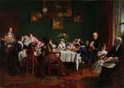 A Victorian dining room with the table set for a birthday tea. In the place of honour sits the little girl, whose health is being drunk, with a large wreath fixed vertically to the back of her chair. The child 'Alice' in the painting is Frith's daughter, later Lady Hastings, the father is a portrait of the artist, and the grandmother is a portrait of Mrs Frith Senior, who kept the Dragon Hotel in Harrogate, from 1826 to 1838. Described by Ruskin as a 'Taking Picture'.