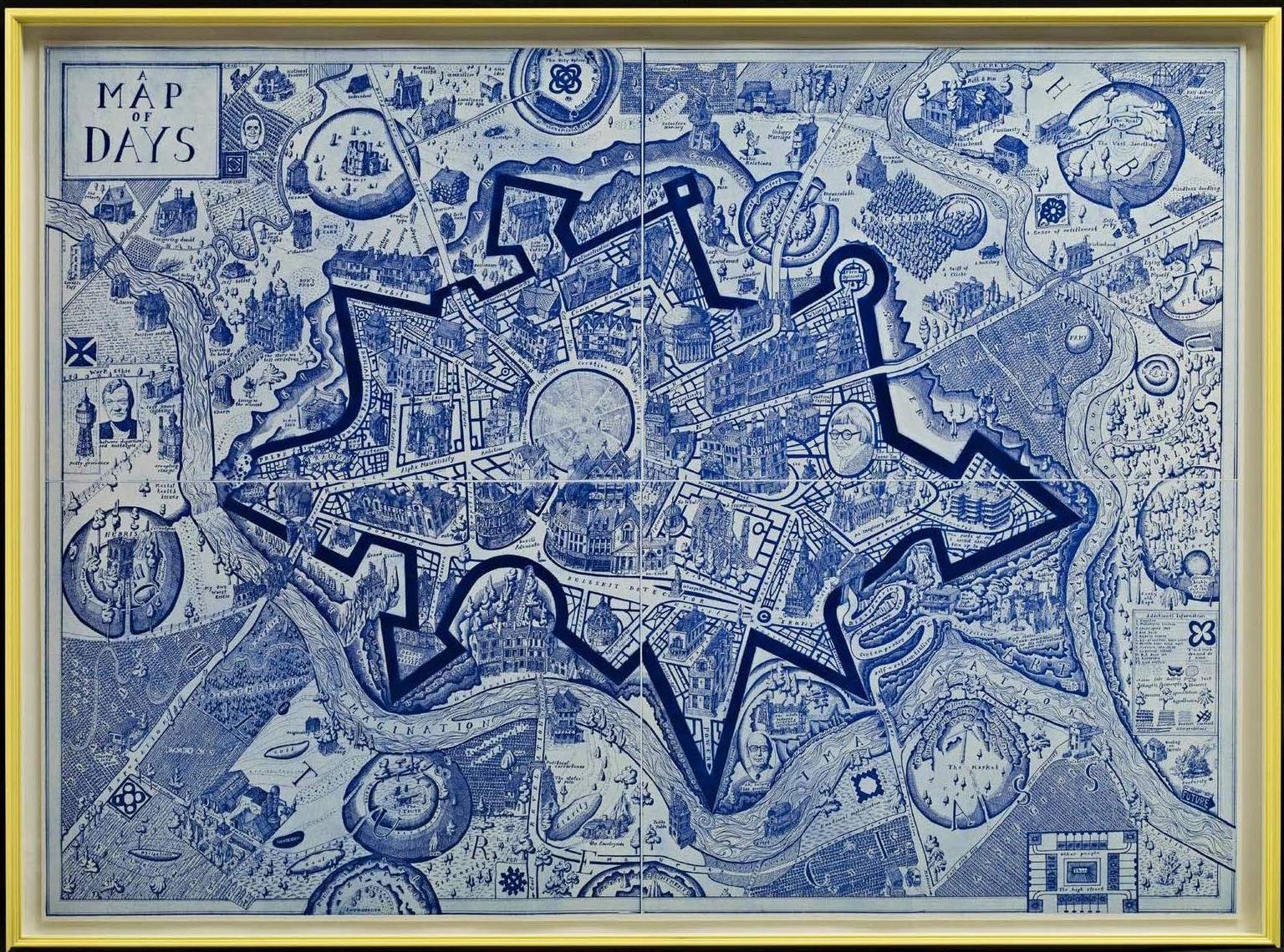 This unusual self-portrait featured in Grayson Perry's 2014 television series Who Are You? Perry depicts himself as a walled city, with areas corresponding to his events, experiences and emotions. Streets labelled 'Alpha Masculinity' and 'Common Humanity' meet at buildings named 'Reptilian Brain' and 'Sexism', while the outskirts of the town are dotted with miniature portraits of individuals who feature prominently in Perry's psyche, from Bradley Wiggins to Philip Larkin.
