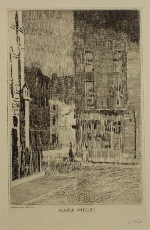 All the characters of this work, down to the differentiation between sky, artificial light, window surface and brick wall are achieved by means of parallel vertical lines, with only a breaking of the line in the sky and a light cross hatching in the brick, ,to vary the method. This etching is part of a collection of 10 etchings by contemporary artists presented to Victoria Art Gallery, Bath; Central Library, Dundee; New Walk Museum and Art Gallery, Leicester and Astley Cheetham Public Library and Art Gallery, Stalybridge.