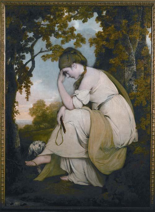 A female figure seated in a comtemplative attitude with a small dog near her left foot. The subject is from Sterne's 'Sentimental Journey' and the model was Mrs Richard Bassano. Signed: I W.pinxt, 1781.