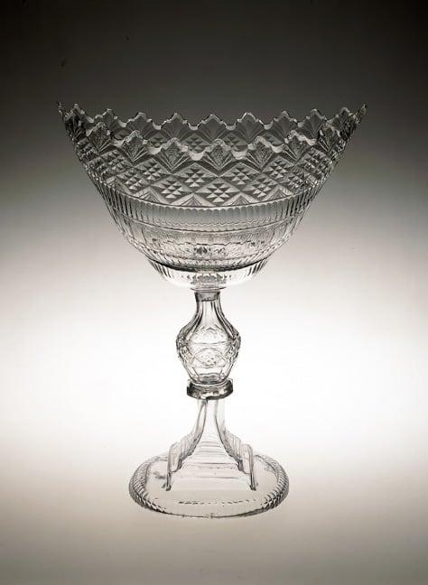 Canoe shaped bowl which sits on a detachable stand decorated with flat cut diamonds, hollow flutes and a bevelled fan cut Vandyck rim. Dublin or Cork glasshouse.