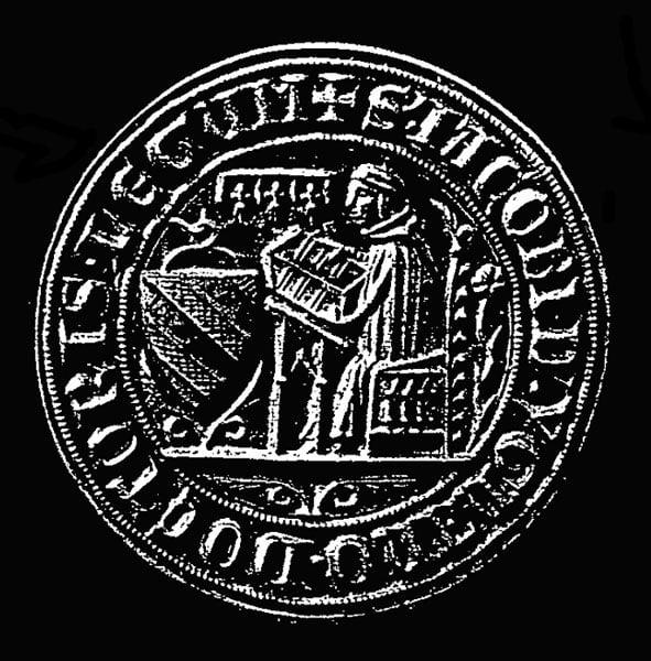 Once gilt, of circular form, with floriated loop at back, representing the doctor of law at his desk, a book open before him and a shield of arms and label. Inscription round the edge in Lombardic characters: s(iggillum) Jacobi d'Ygnano, doctoris legum.