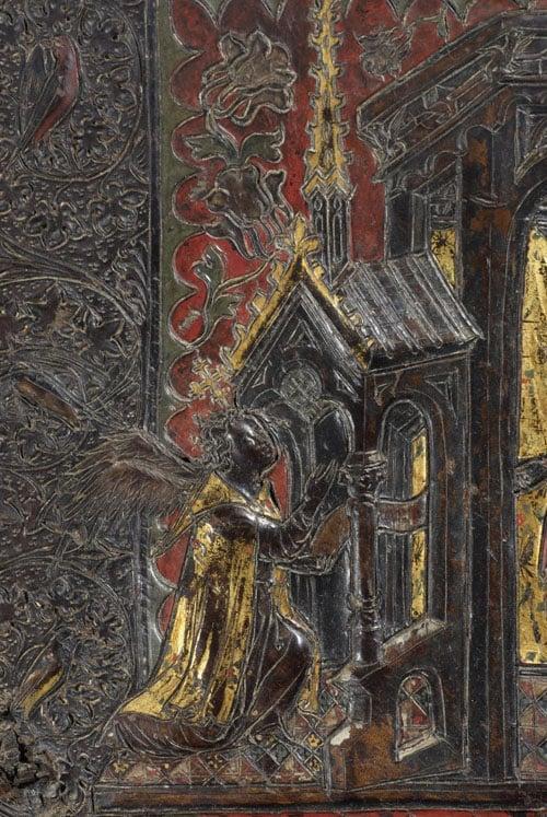 Decorated with secular subjects. Sides show scenes of lovers talking and embracing beneath trees. Inner lid is gilded and painted with the Annunciation. Inside is a painted cloth showing John Talbot, and his wife Maud kneeling at the foot of the cross. This may have been inserted in the 1840's by Pugin or Thomas Willement.